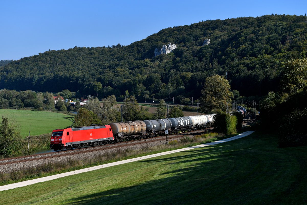 Mit einem Kesselwagenzug rauschte 185 305 am Nachmittag des 28. September 2018 durch das malerische Altmühltal, hier aufgenommen bei Breitenfurt.