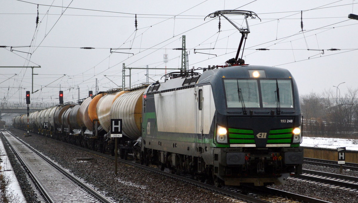 SETG - Salzburger Eisenbahn TransportLogistik GmbH mit der ELL Vectron  193 248  [NVR-Number: 91 80 6193 248-2 D-ELOC] und einem Kesselwagenzug für Kreideschlamm-Transporte (leer) am 26.01.19 Durchfahrt Bf. Flughafen Berlin-Schönefeld.