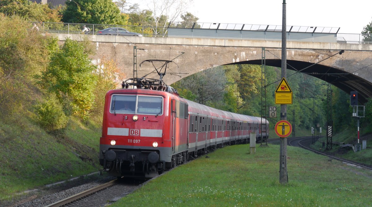 111 097 zieht eine n-Wagen Garnitur in den Haltepunkt Darmstadt Süd. Aufgenommen am 27.9.2017 17:28 HINWEIS: Bild seit Bahnhofsumbau 2020 so nicht mehr möglich!