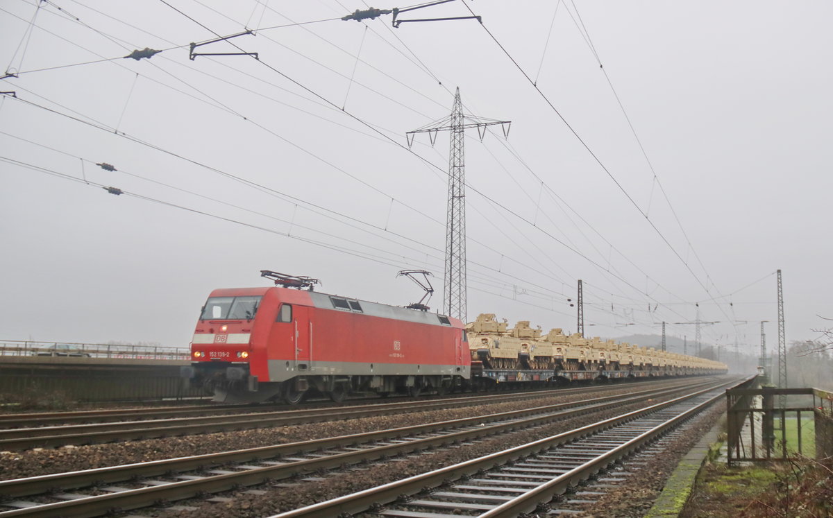 DB Cargo Deutschland AG  mit  152 054-3  [NVR-Number: 91 80 6152 054-3 D-DB] und einem Transportzug für Militärfahrzeuge (leer) am 28.01.19 Bf. Flughafen Berlin-Schönefeld.