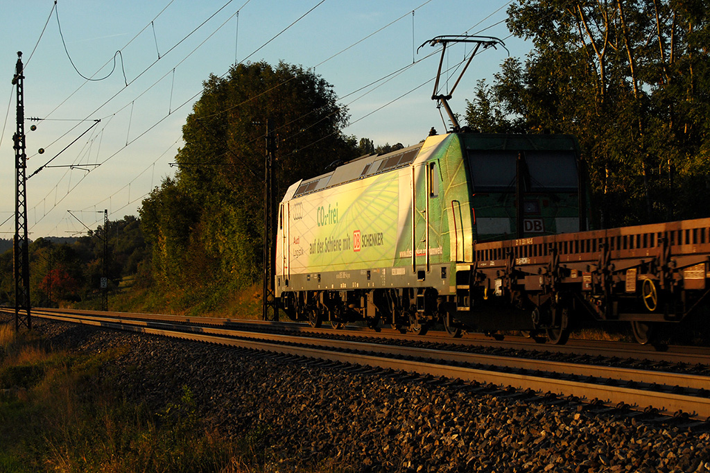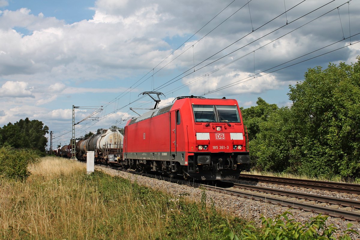Am 20.07.2017 bespannte 185 361-3 einen gemischten Güterzug von Mannheim Rbf bis an die Schweizer Grenze nach Basel, als sie südlich von Buggingen durchs Rheintal fuhr.