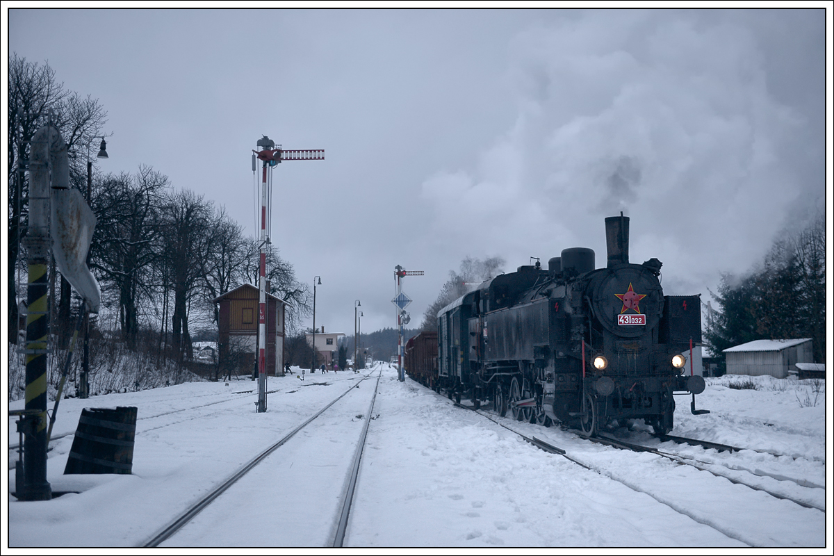 431.032 (ex ÖBB 93.1360) am 12.1.2019 mit ihrem Pn 59253 von Poniklá nach Martinice v Krk. beim Einfahrsignal Martinice.
