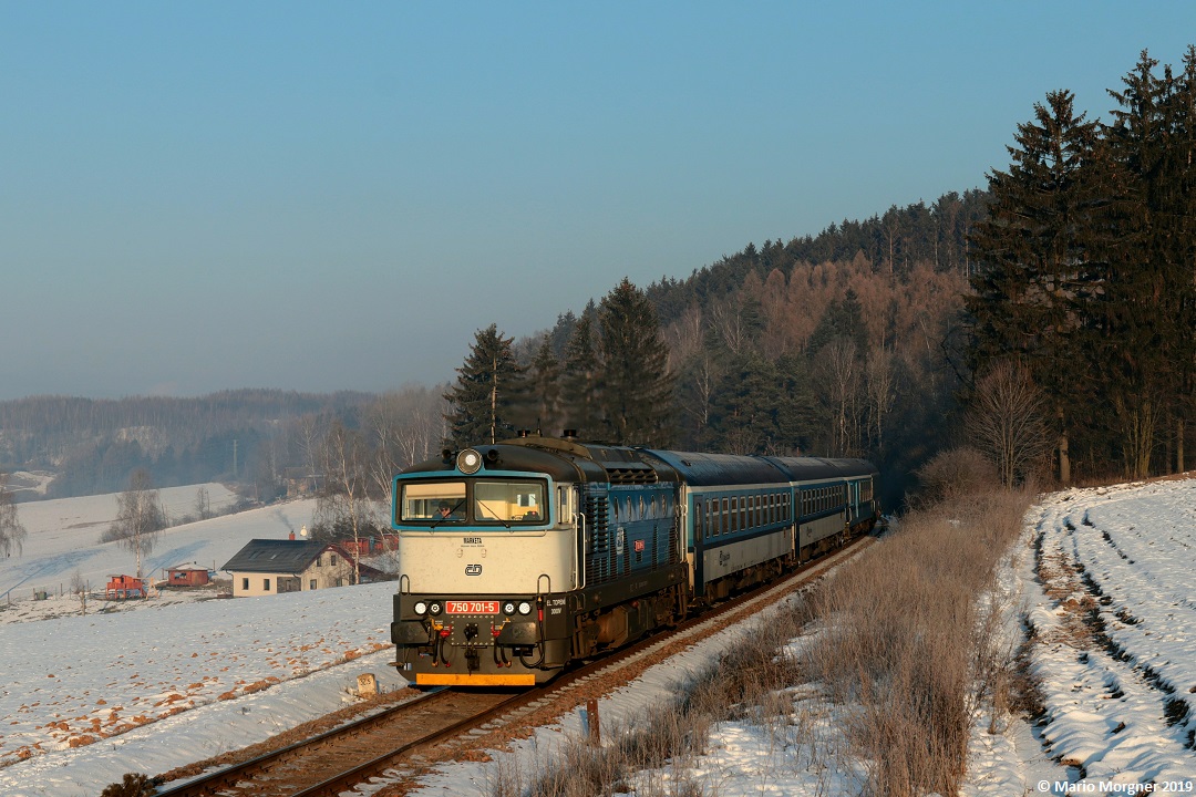 431.032 (ex ÖBB 93.1360) am 13.1.2019 mit ihrem Pn 59262 von Martinice nach Rokytnice n. Jizerou kurz vor Poniklá aufgenommen. Weil der Zug etwas Verspätung hatte endete dieser Zug in weiterer Folge in Poniklá, um den Fahrplan für die Retourfahrt einzuhalten.