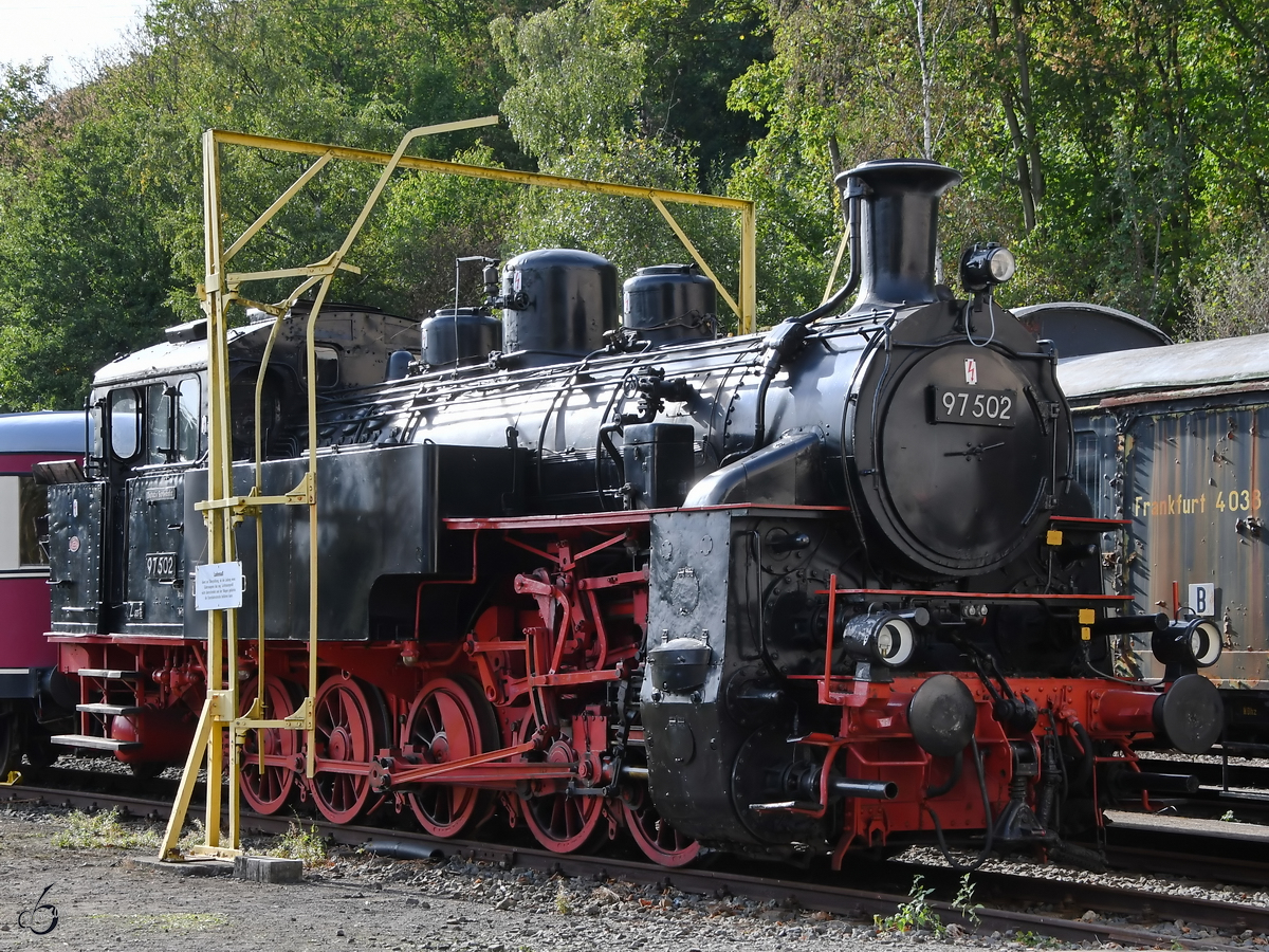 Die Dampflokomotive 97 502 Mitte September 2018 unter der Lichtraumprofil-Messanlage für Güterwagen im Eisenbahnmuseum Bochum-Dahlhausen.