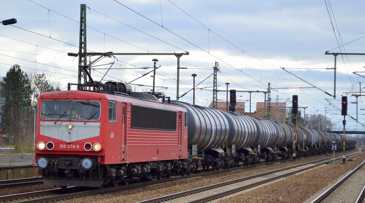 Die Leipziger LEG 155 078-9 (9180 6 155 078-9 D-LEG) mit Kesselwagenzug (Ethanol) am 28.01.19 Durchfahrt Bf. Flughafen Berlin-Schönefeld.