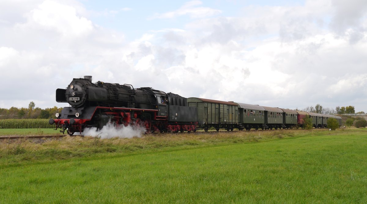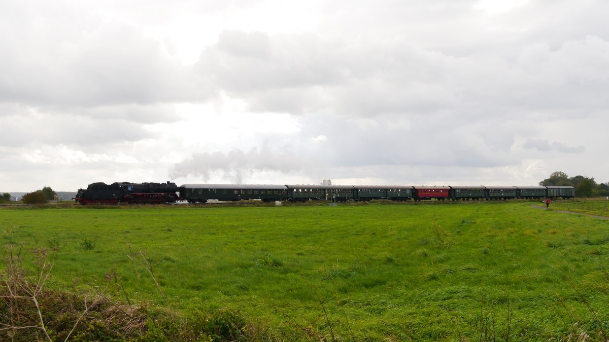 Ein Dampfsonderzug auf seiner Fahrt nach Friedberg zwischen Häuserhof und Echzell. Aufgenommen am 3.10.2017