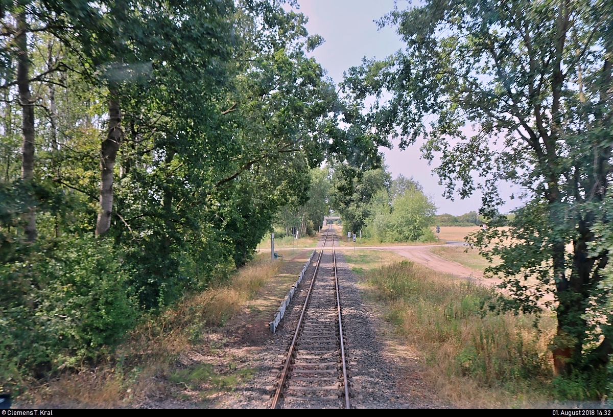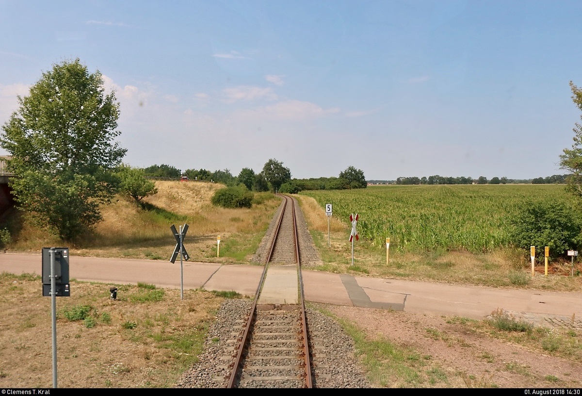 Eine Fahrt auf der Bahnstrecke Dessau–Gohrau-Rehsen (KBS 257) mit 670 003-2 "Fürstin Louise" der Dessauer Verkehrs- und Eisenbahngesellschaft (DVE) als DWE75710 von Dessau Hbf nach Wörlitz... Blick auf den Bahnübergang (BÜ) auf der L 133 nordwestlich des Hp Dessau-Waldersee. [1.8.2018 | 14:25 Uhr]