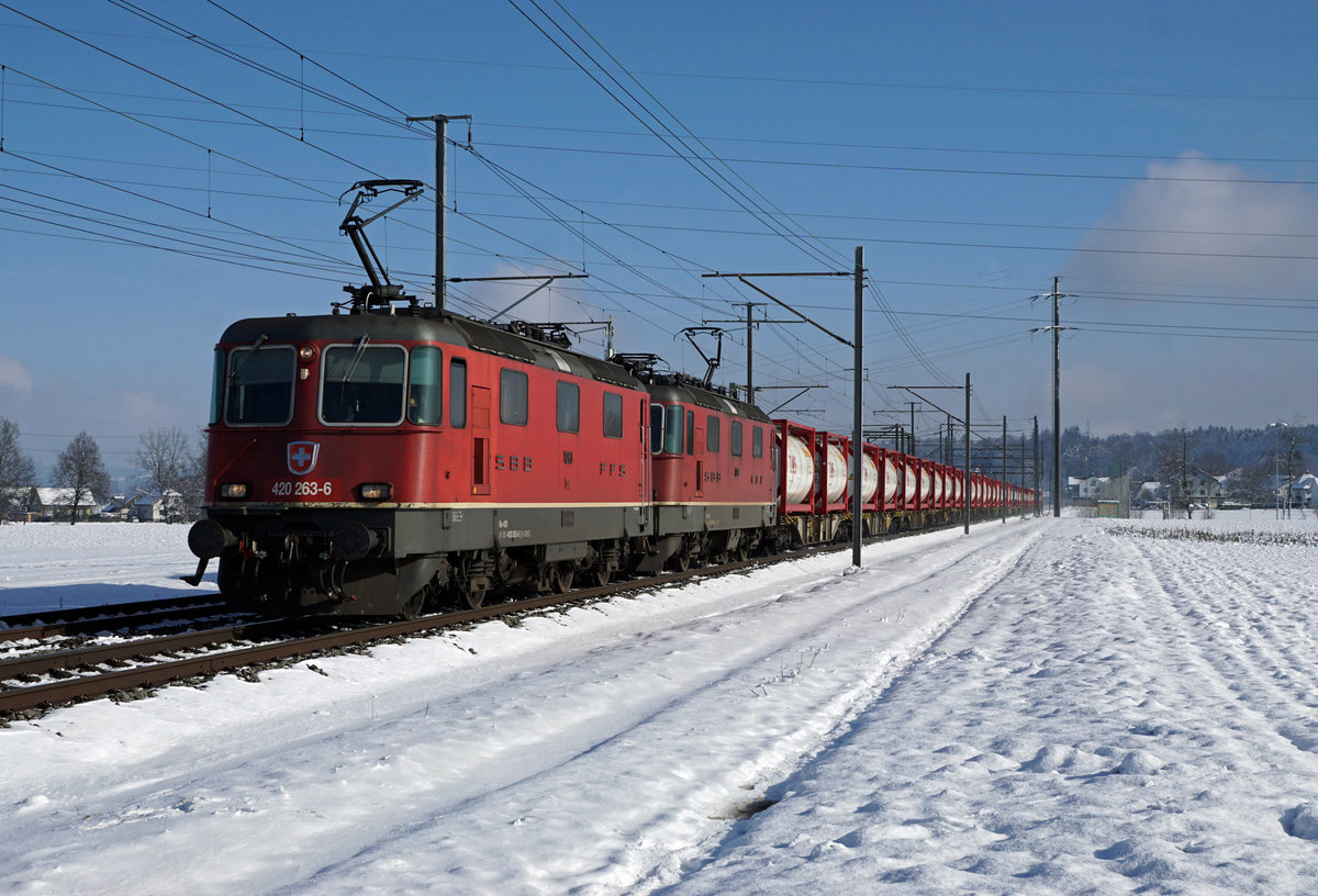 Erste Winteraufnahmen des Jahres 2019 aus meiner Region Solothurn mit Sonne und Schnee. TWS - Tankcontainerzug "SIRUPZUG 48683 Basel Bad Bf - Aarberg" bei Deitingen mit Doppeltraktion Re 420 am 29. Januar 2019. An der Spitze dieses Zuges eingereiht ist die Re 420 263-6. Foto: Walter Ruetsch