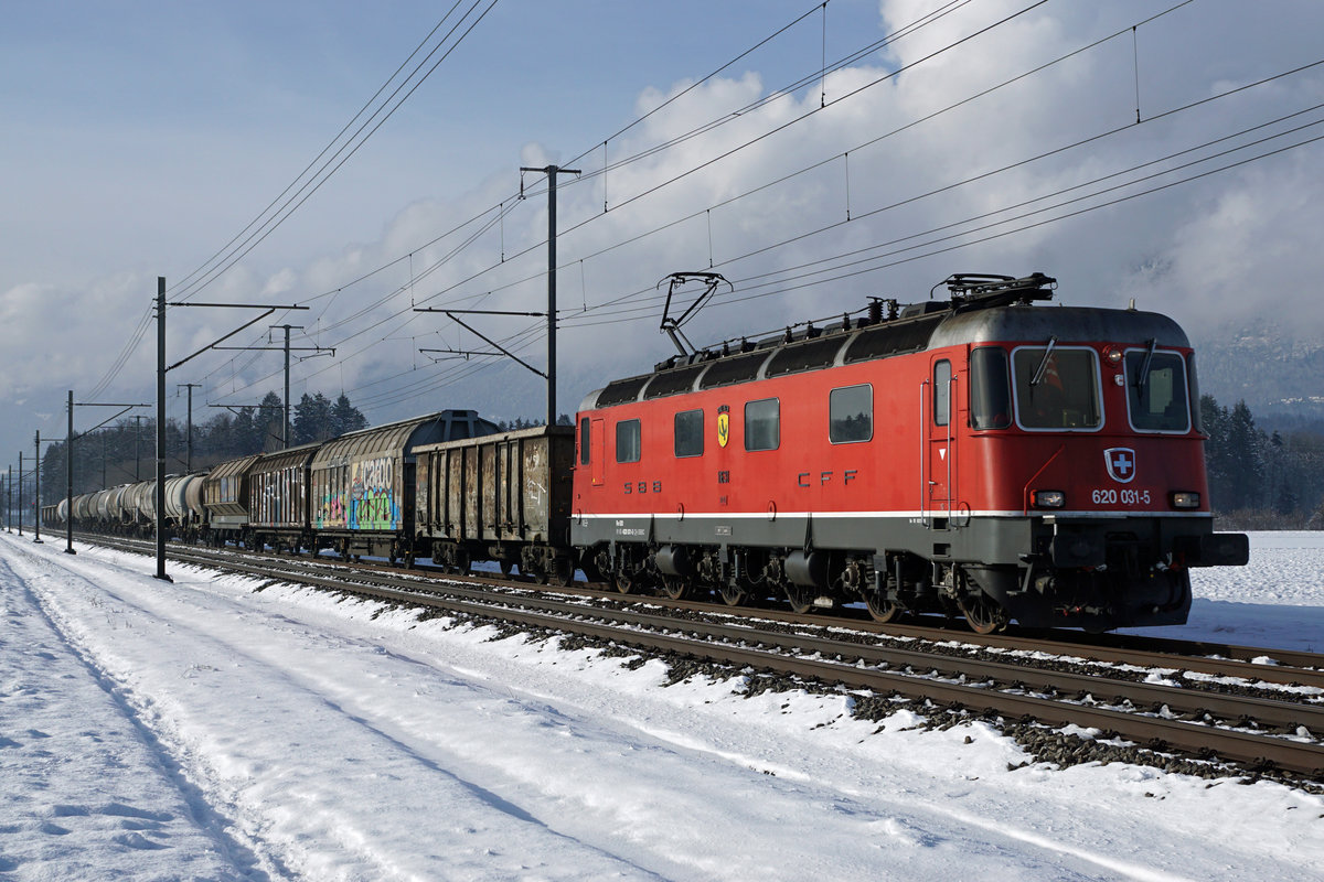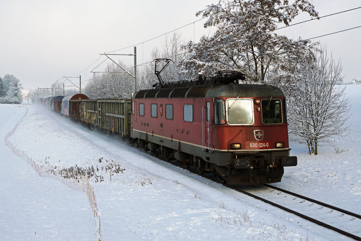 Erste Winteraufnahmen des Jahres 2019 aus meiner Region Solothurn mit Sonne und Schnee. Güterzug RBL - Gerlafingen mit der Re 620 024-0 zwischen Solothurn und Biberist am 29. Januar 2019. Leider ist die "ROTHRIST" nur noch mit einem Wappen unterwegs. Foto: Walter Ruetsch