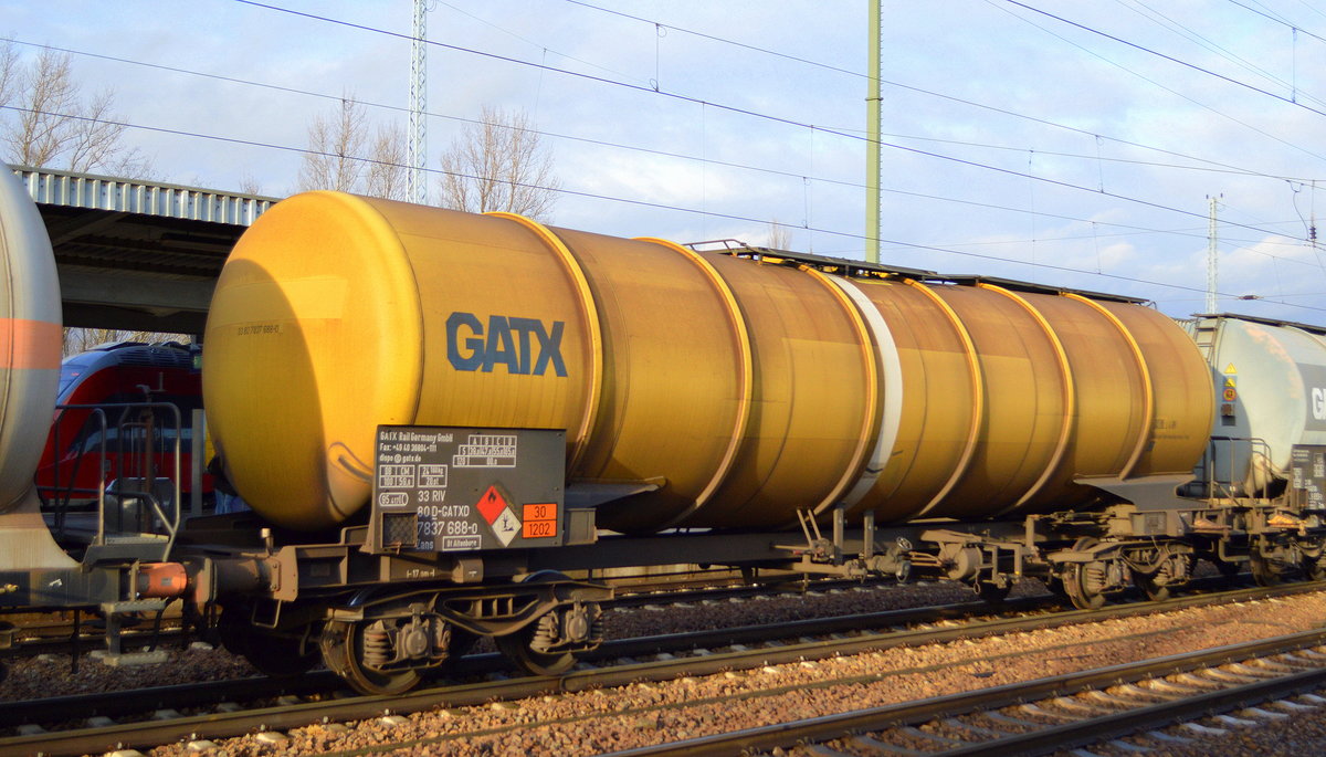 Gelber Kesselwagen vom Einsteller GATX Deutschalnd mit der Nr. 33 RIV 80 D-GATXD 7837 688-0 Zans Bf. Altenburg (UN-Nr. 30/1202 = Dieselkraftstoff oder Gasöl oder Heizöl (leicht)) am 27.01.19 in einem gemischten Güterzug Bf. Flughafen Berlin-Schönefeld.