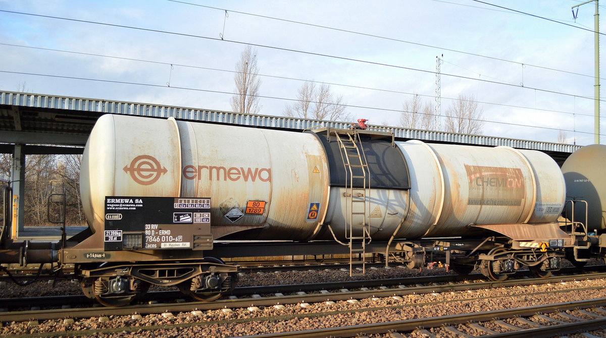Kesselwagen vom Einsteller ERMEWA SA in Deutschland mit der Nr. 33 RIV 80 D-ERMD 7846 010-6(P) Zacns Bf. Maschen Rbf.  altes CHEMION Firmenlogo  (UN-Nr. 80/1789 = Salzsäure) am 27.01.19 in einem gemischten Güterzug Bf. Flughafen Berlin-Schönefeld.