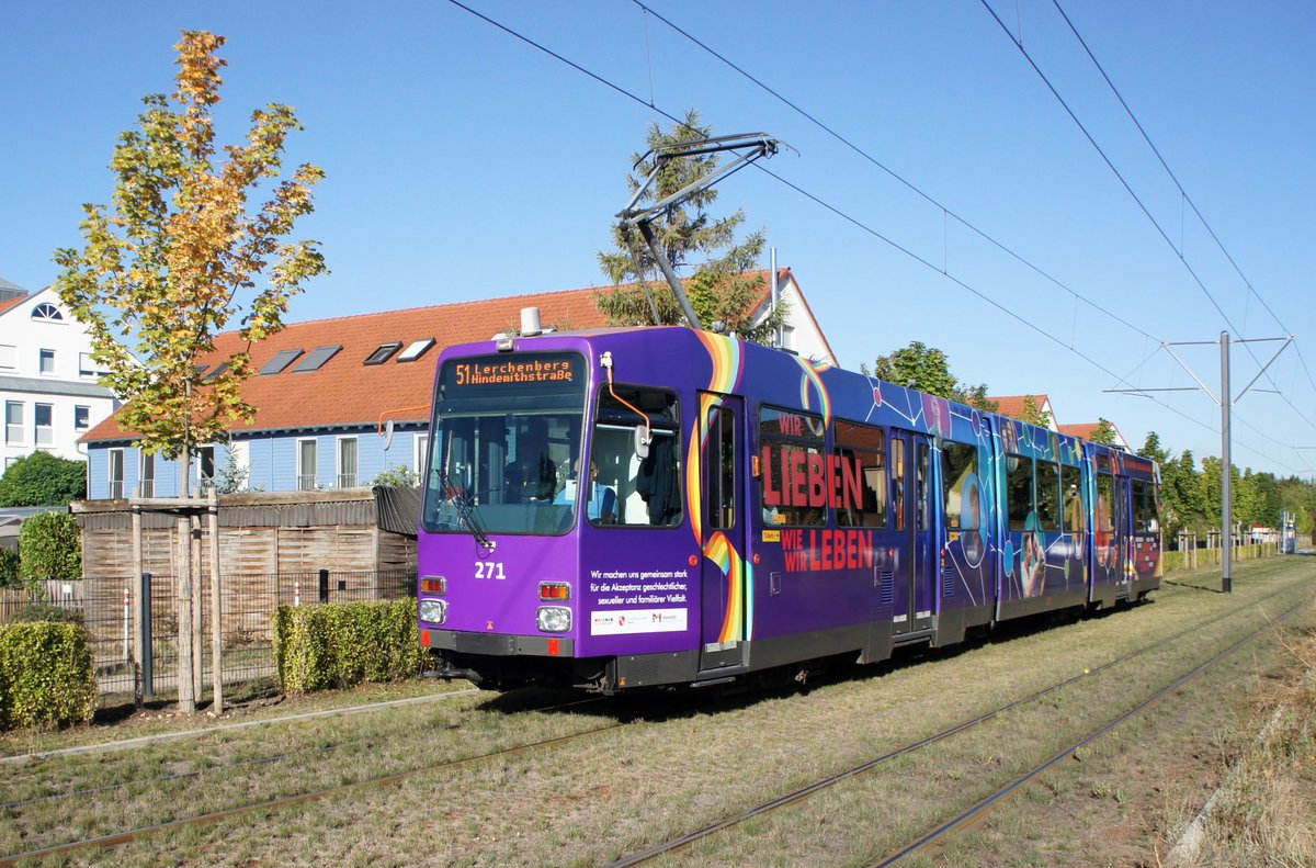 Straßenbahn Mainz / Mainzelbahn: Duewag / AEG M8C der MVG Mainz - Wagen 271, aufgenommen im September 2018 in Mainz-Bretzenheim.