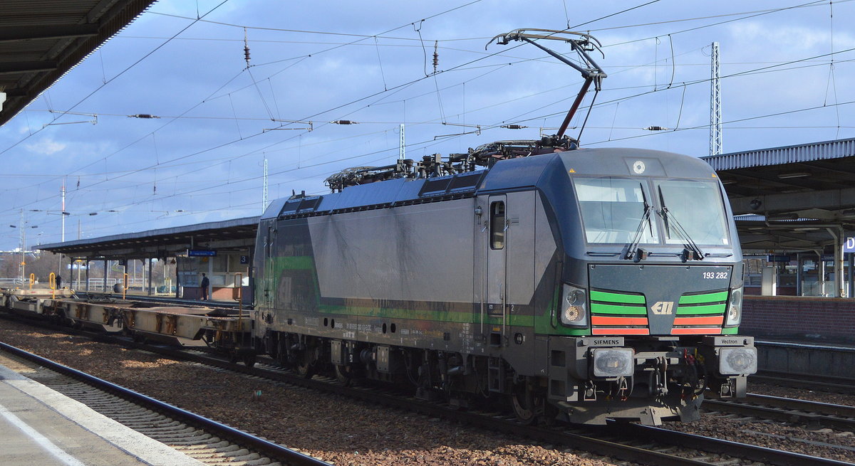 TXL - TX Logistik AG mit der ELL Vectron "193 282" [NVR-Number: 91 80 6193 282-1 D-ELOC] und nicht vollständig voll beladenen KLV-Zug ab Rostock bei der Durchfahrt Bf. Flughafen berlin-Schönefeld, 28.01.19