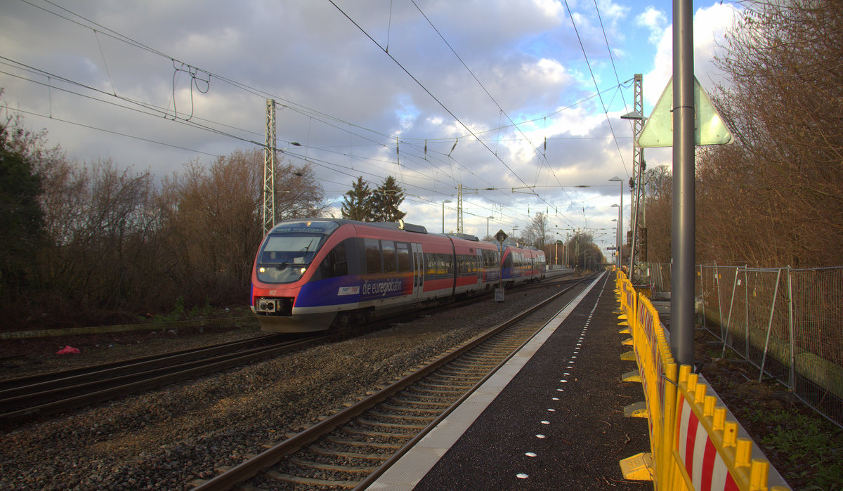 wei Euregiobahn (RB20) aus Alsdorf-Annapark nach Stolberg-Altstadt,Düren und kammen die Kohlscheider-Rampe hoch aus Richtung Herzogenrath und halten in Kohlscheid und fahren in Richtung Richterich,Laurensberg,Aachen-West,Aachen-Schanz,Aachen-Hbf. Aufgenommen vom Bahnsteig 1 in Kohlscheid. Bei Sonne und Wolken am Kalten Nachmittag vom 28.1.2019.