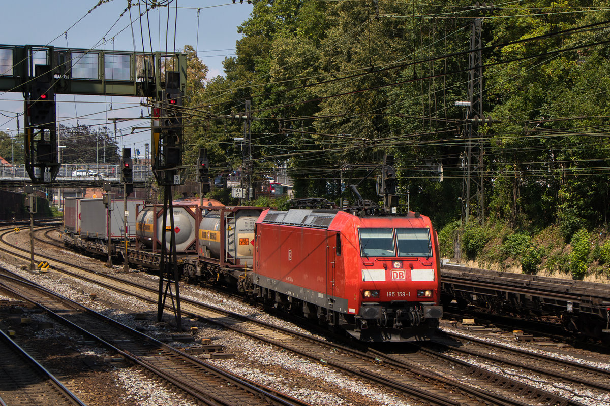 185 159-1 ist am 25. Juli 2018 in Offenburg mit einem Güterzug unterwegs.