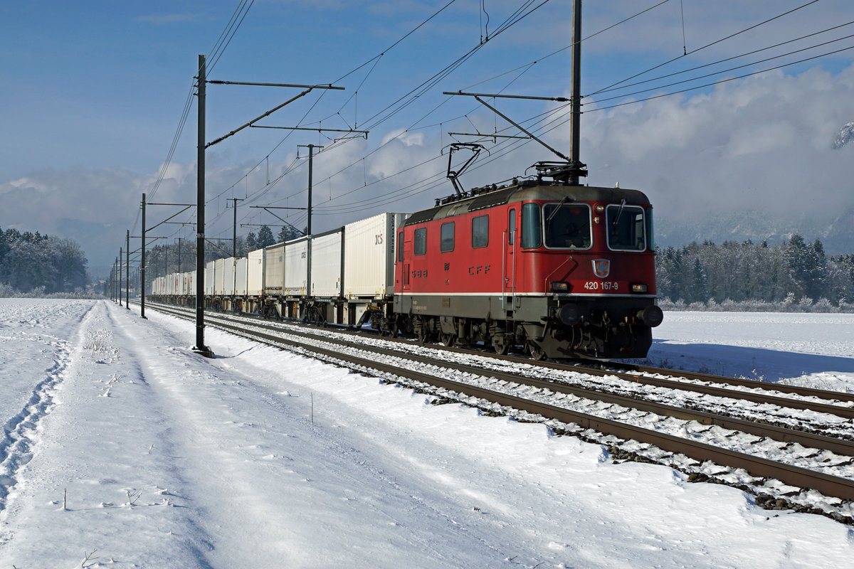 Erste Winteraufnahmen des Jahres 2019 aus meiner Region Solothurn mit Sonne und Schnee. Re 420 167-9 mit Containerzug. Die Re 4/4 sind Universal-Elektrolokomotiven der SBB. Dementsprechend gelangen sie bei SBB CARGO vor allen Kategorien von Güterzügen zum Einsatz. Als "BOBO-Freund" widme ich bei meiner Einstellung vom 30. Januar 2019 die gesamte bei BB.de mögliche Serie bestehend aus sechs Bildern diesen fotogenen Maschinen. Entstanden sind alle Aufnahmen am 29. Januar 2019 bei Deitingen. Foto: Walter Ruetsch