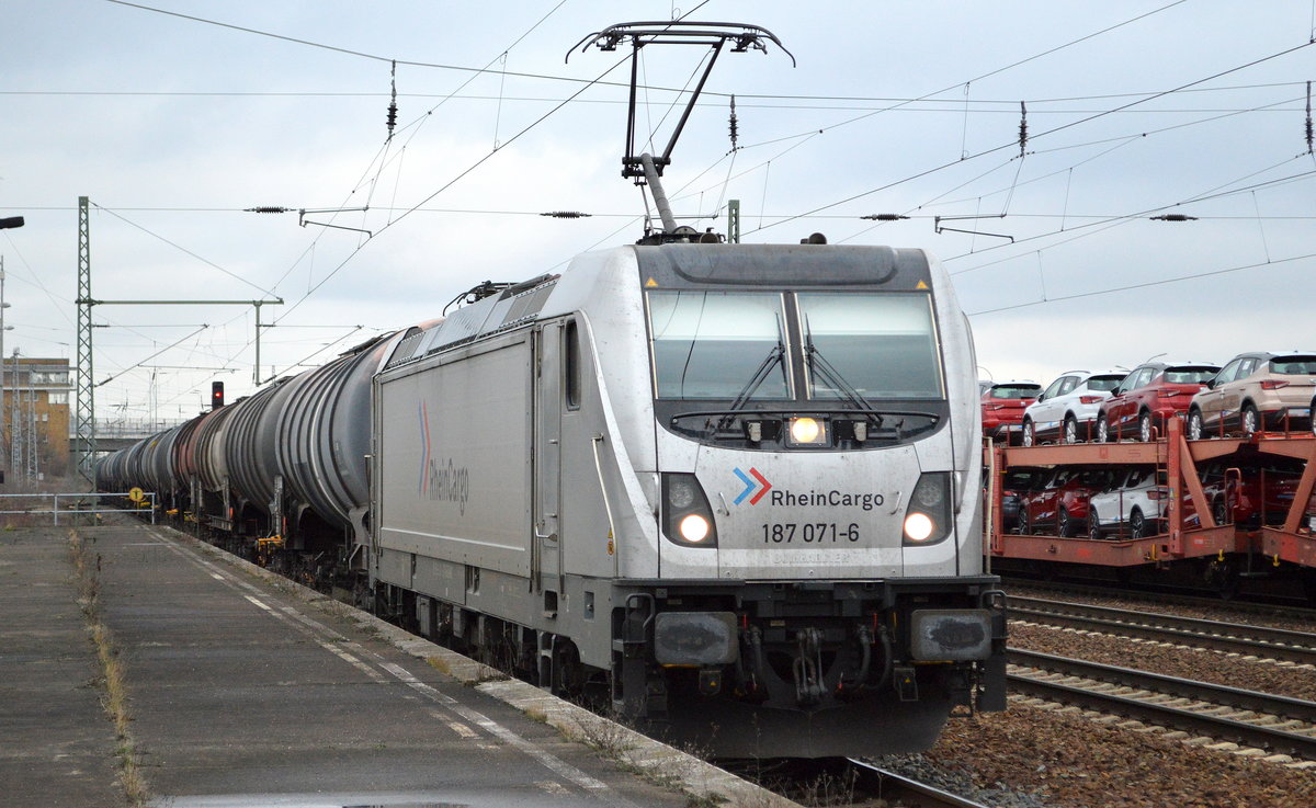 RheinCargo GmbH & Co. KG mit der  187 071-6  [NVR-Number: 91 80 6187 071-6 D-RHC] und Kesselwagenzug (Erdölprodukte) am 29.01.19 Bf. Flughafen Berlin-Schönefeld.