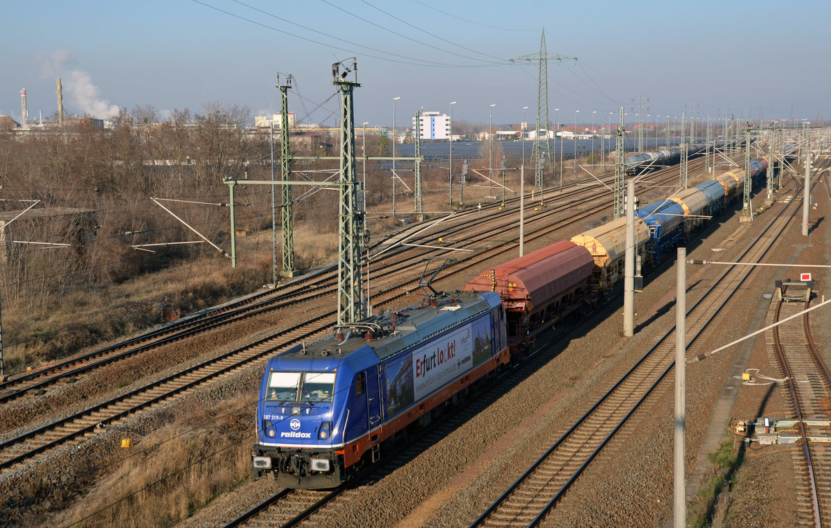187 319 der raildox rollte mit einem Schwenkdachwagenzug am 20.01.19 durch Bitterfeld Richtung Halle(S).