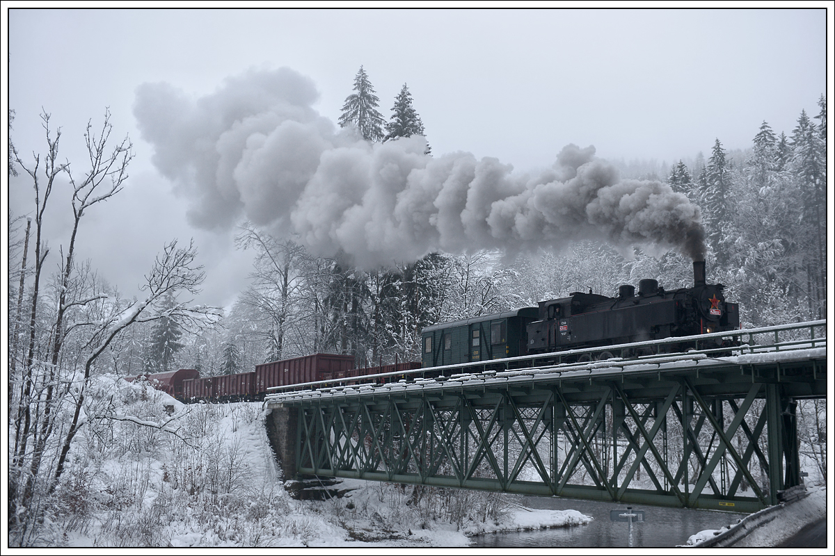 431.032 (ex ÖBB 93.1360) am 13.1.2019 mit ihrem Pn 59283 von Poniklá nach Martinice v Krk. kurz nach der Ausfahrt aus Hrabačov aufgenommen.
