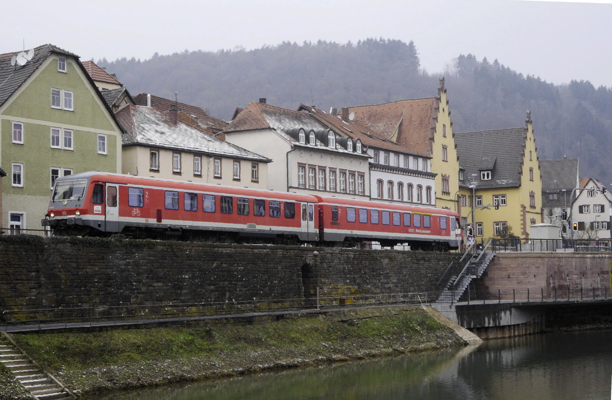 628 440 als RE 4387 Aschaffenburg - Crailsheim am Tauber-Ufer in Wertheim (25.1.19). Die 628er auf der Westfrankenbahn dürften das Jahr 2019 wohl nicht überleben. Der neue Verkehrsvertrag, gültig ab Fahrplanwechsel, sieht nur noch den Einsatz modernisierter Desiros vor. Lediglich die mintgrünen "Anna" und "Maria" bleiben als nostalgische Reserve.