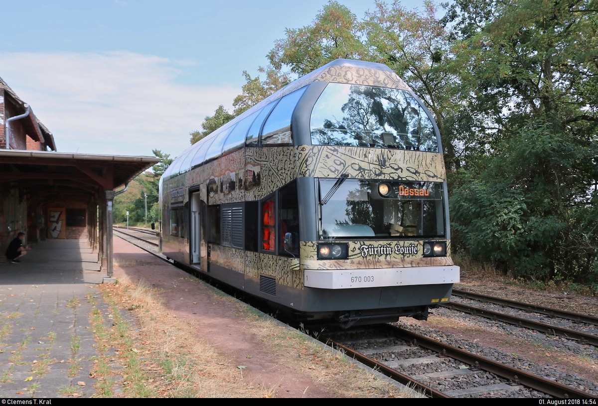 670 003-2 "Fürstin Louise" der Dessauer Verkehrs- und Eisenbahngesellschaft (DVE) als DWE75711 nach Dessau Hbf steht in ihrem Startbahnhof Wörlitz. [1.8.2018 | 14:54 Uhr]
