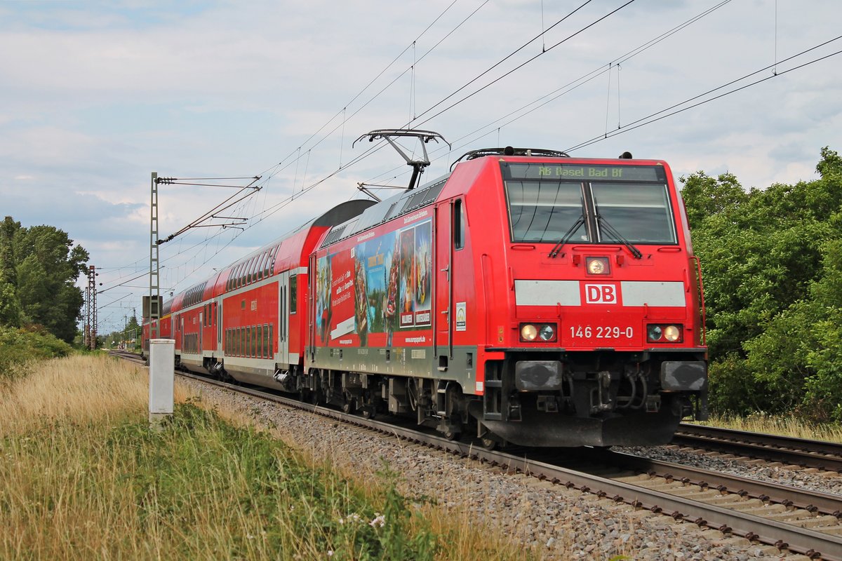 Mit einer RB (Offenburg - Neuenburg (Baden)) fuhr am 20.07.2017 die 146 115 "Baden Württemberg erfahren/Landkreis Breisgau-Hochschwarzwald" aus dem Hp. Buggingen gen Müllheim (Baden).