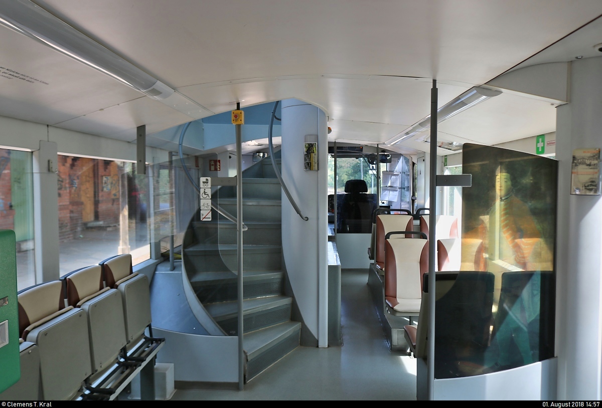 Blick auf eine der beiden Wendeltreppen von 670 003-2 "Fürstin Louise" der Dessauer Verkehrs- und Eisenbahngesellschaft (DVE), die in den Oberstock führen. Diese steht als DWE75711 nach Dessau Hbf in ihrem Startbahnhof Wörlitz. [1.8.2018 | 14:58 Uhr]