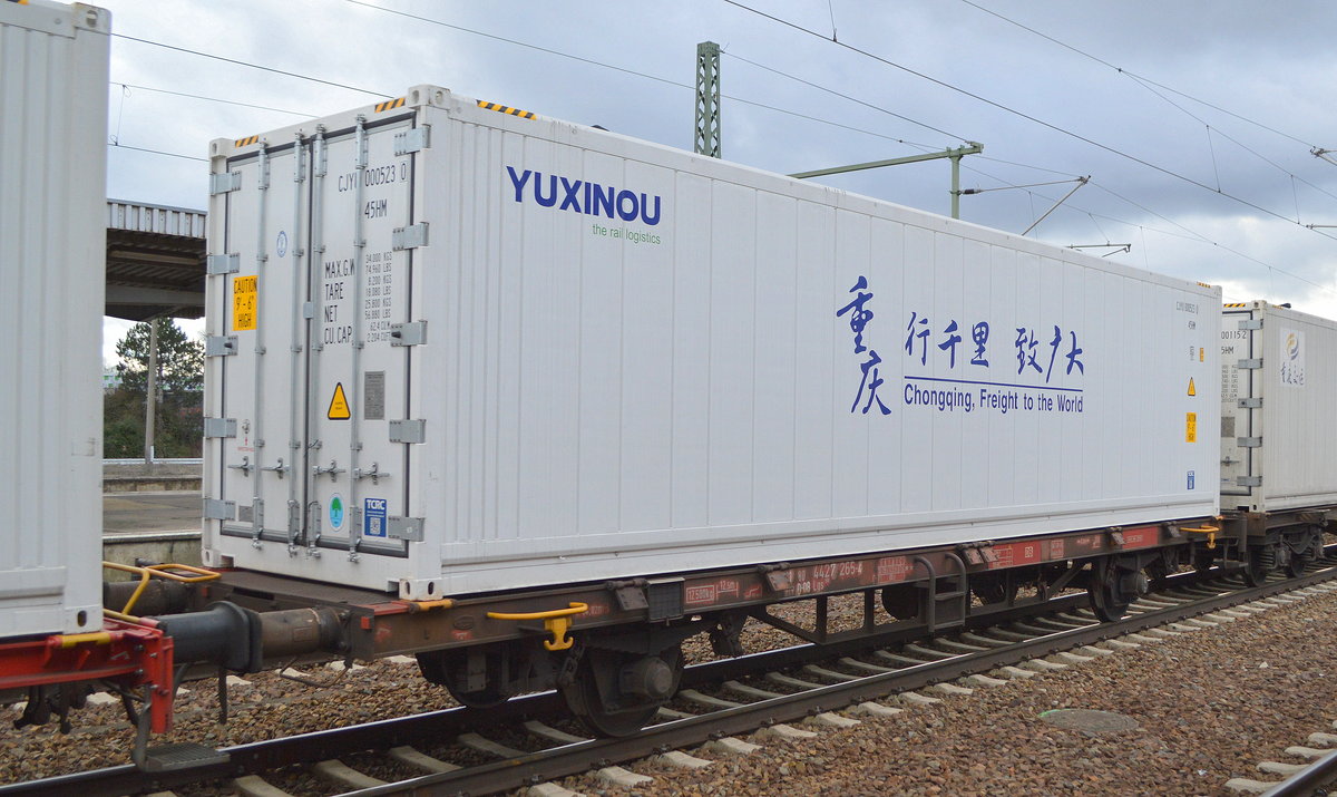Containertragwagen der DB Cargo Deutschland AG mit der Nr. 21 RIV 80 D-DB 4427 265-4 Lgs 580 beladen mit einem weißen noch ganz frischen 40ér Container mit der Beschriftung "YUXINOU the rail logistics" der China Silk Road auf dem Weg erstmal Richtung Polen, 29.01.19 Bf. Flughafen Berlin-Schönefeld.