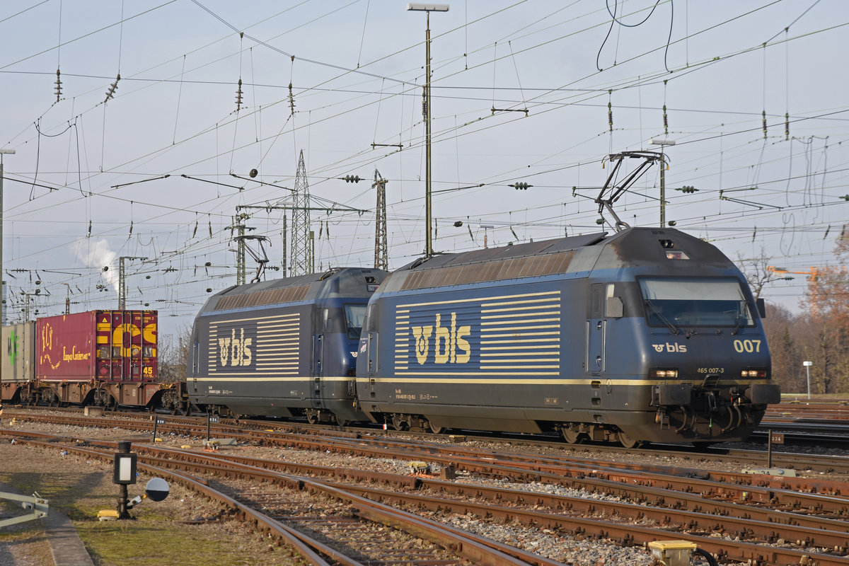 Doppeltraktion, mit den BLS Loks 465 007-3 und 465 017-2, durchfährt den badischen Bahnhof. Die Aufnahme stammt vom 23.01.2019.