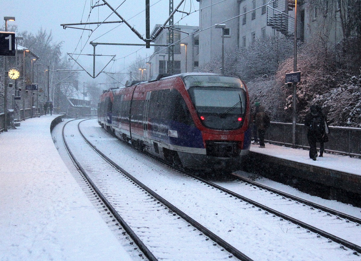 Zwei Euregiobahn (RB20) aus Alsdorf-Annapark nach Langerwehe,Stolberg-Altstadt und kommen die Kohlscheider-Rampe hoch aus Richtung Herzogenrath und halten in Kohlscheid und fuhren in Richtung Richterich,Laurensberg,Aachen-West,Aachen-Schanz,Aachen-Hbf. Aufgenommen von Bahnsteig 2 in Kohlscheid. Bei dichtem Schneefall am Kalten Morgen vom 30.1.2019.