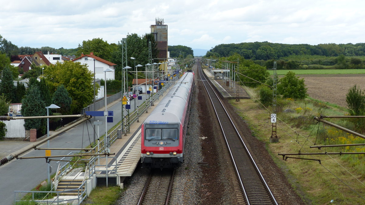 Ein wegen Bauarbeiten bereits in Riedstadt-Goddelau endender RE70 erreicht gerade ebenjenen Bahnhof auf Gleis 5. Aufgenommen am 9.9.2017 18:45