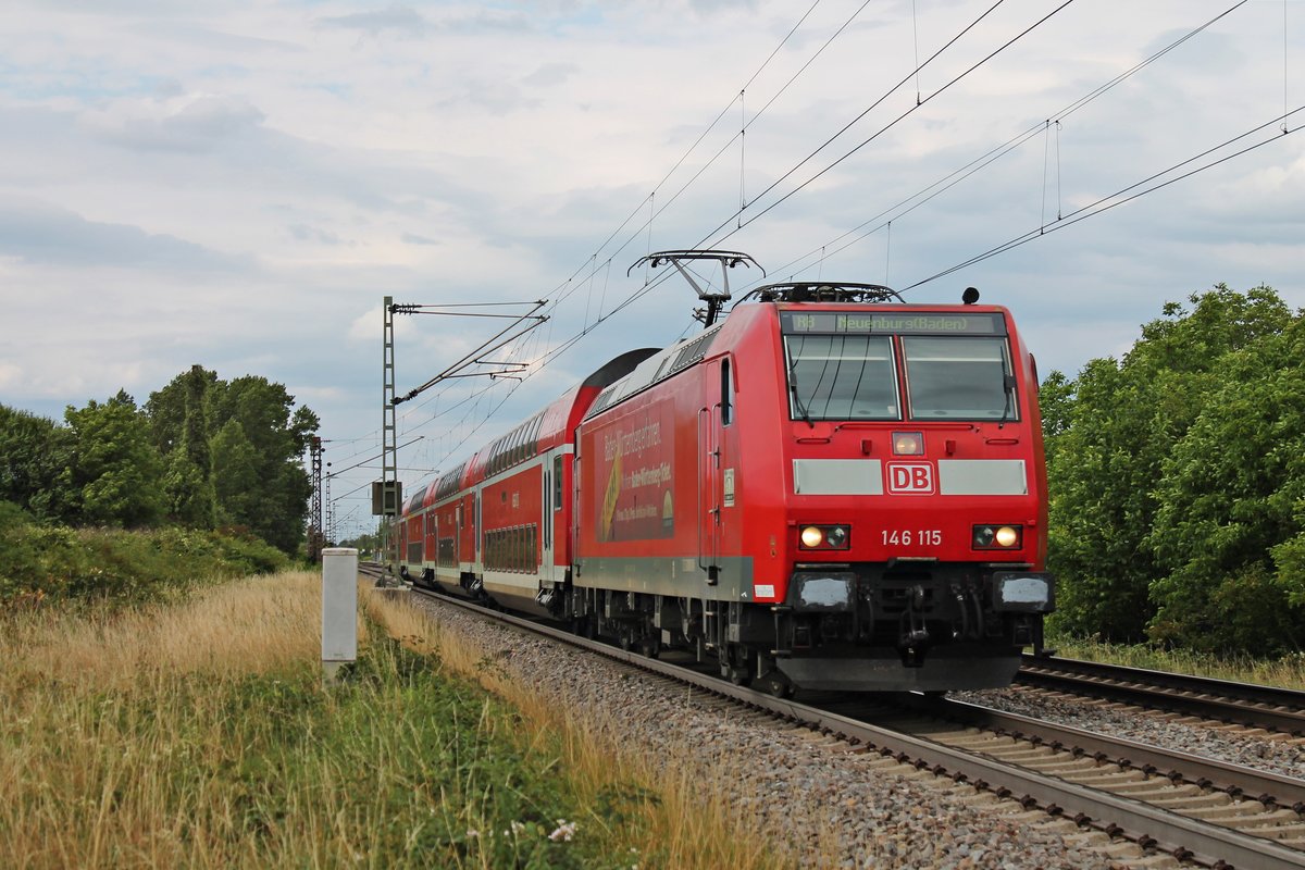 Mit einer RB (Offenburg - Neuenburg (Baden)) fuhr am 20.07.2017 die 146 115  Baden Württemberg erfahren/Landkreis Breisgau-Hochschwarzwald  aus dem Hp. Buggingen gen Müllheim (Baden).