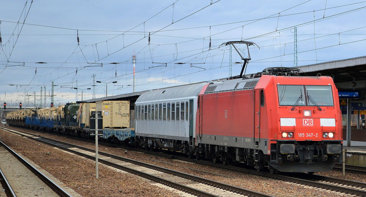 Schon irgendwie beunruhigend, es ist verdammt viel Militärgerät im Moment auf Deutschlands Schienen unterwegs! Hier ist die  DB Cargo Deutschland AG   185 347-2  [NVR-Number: 91 80 6185 347-2 D-DB] mit deutschen und polnischen Güterwagen mit Teilen einer US-amerikanischen Panzer-Brigade in Wüstentarnfarbe unterwegs, der Zug kam wohl aus Richtung Cottbus, 28.01.19 Bf. Flughafen Berlin-Schönefeld.