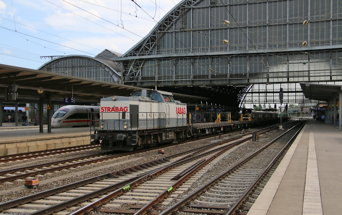 Strabag 203 166-4 mit Gleiswagen beim durchfahren der Halle des Hauptbahnhofs Bremen. Aufgenommen am 11.05.2016.