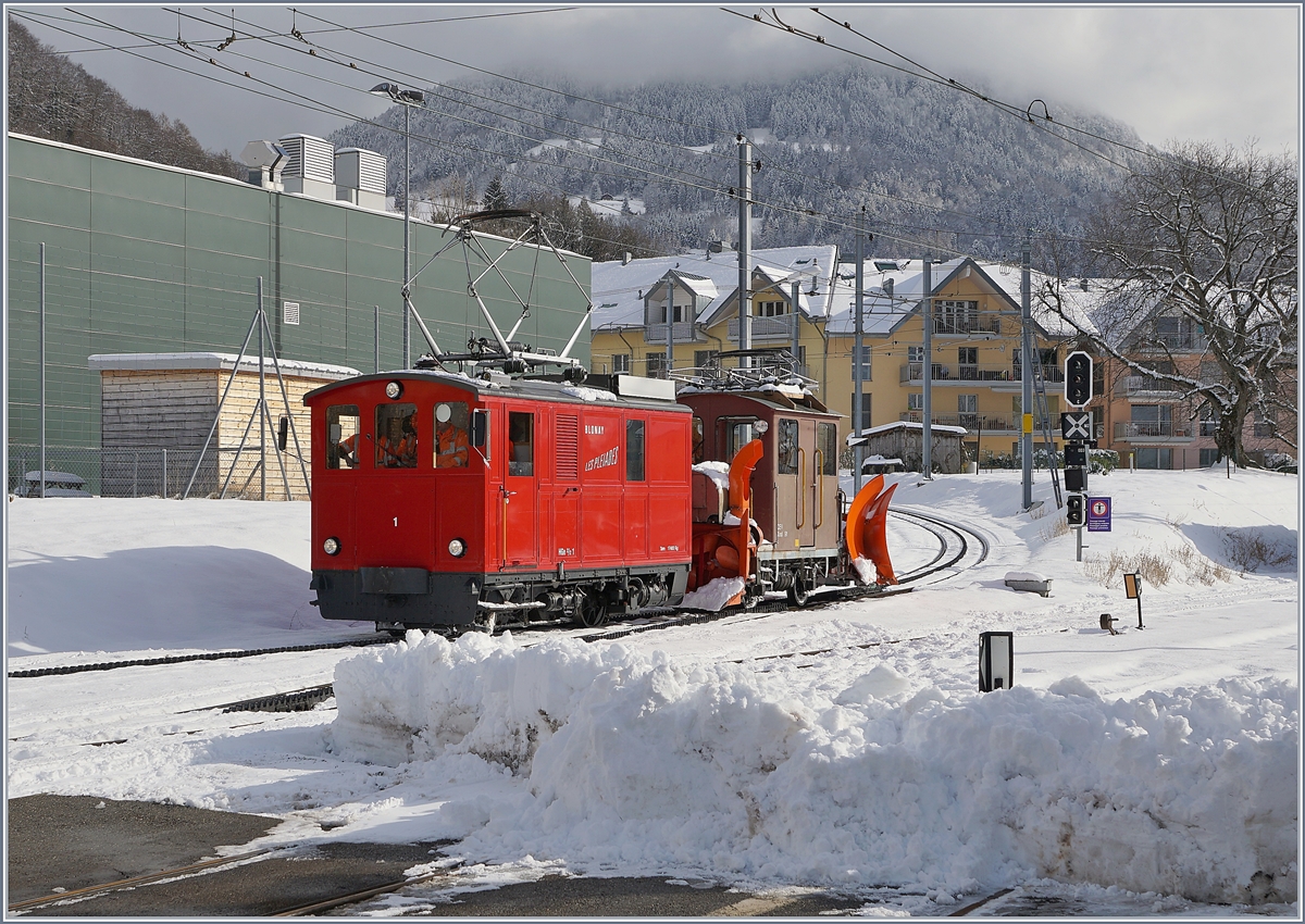 Wenn es schneit, rückt die CEV HGe 2/2 N° 1 mit dem Xrot 91 aus, hier ist das Gespann bereits wieder auf dem Rückweg in Dépôt von Blonay.