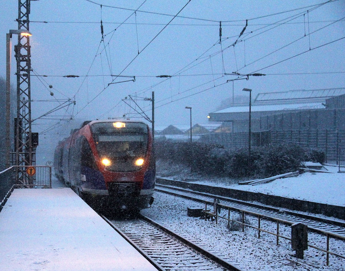 Zwei Euregiobahn (RB20) kommt aus Düren nach Herzogenrath,Alsdorf und kommt aus Richtung Aachen-West,Laurensberg,Richterich und halten in Kohlscheid und fahren in Richtung Herzogenrath. Aufgenommen vom Bahnsteig 2 in Kohlscheid. Bei dichtem Schneefall am Kalten Morgen vom 30.1.2019.