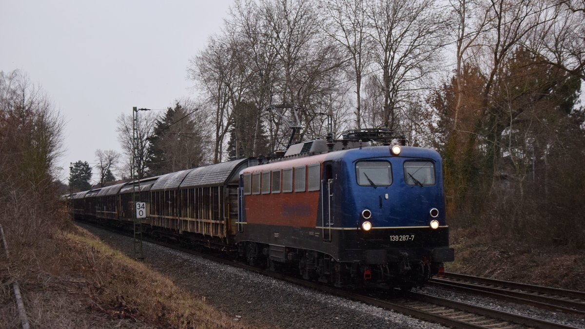 139 287 zieht den Henkelzug nach Gunzenhausen über die Rhein-Main Bahn kurz vor Darmstadt Kranichstein. Aufgenommen am 30.1.2019 15:39