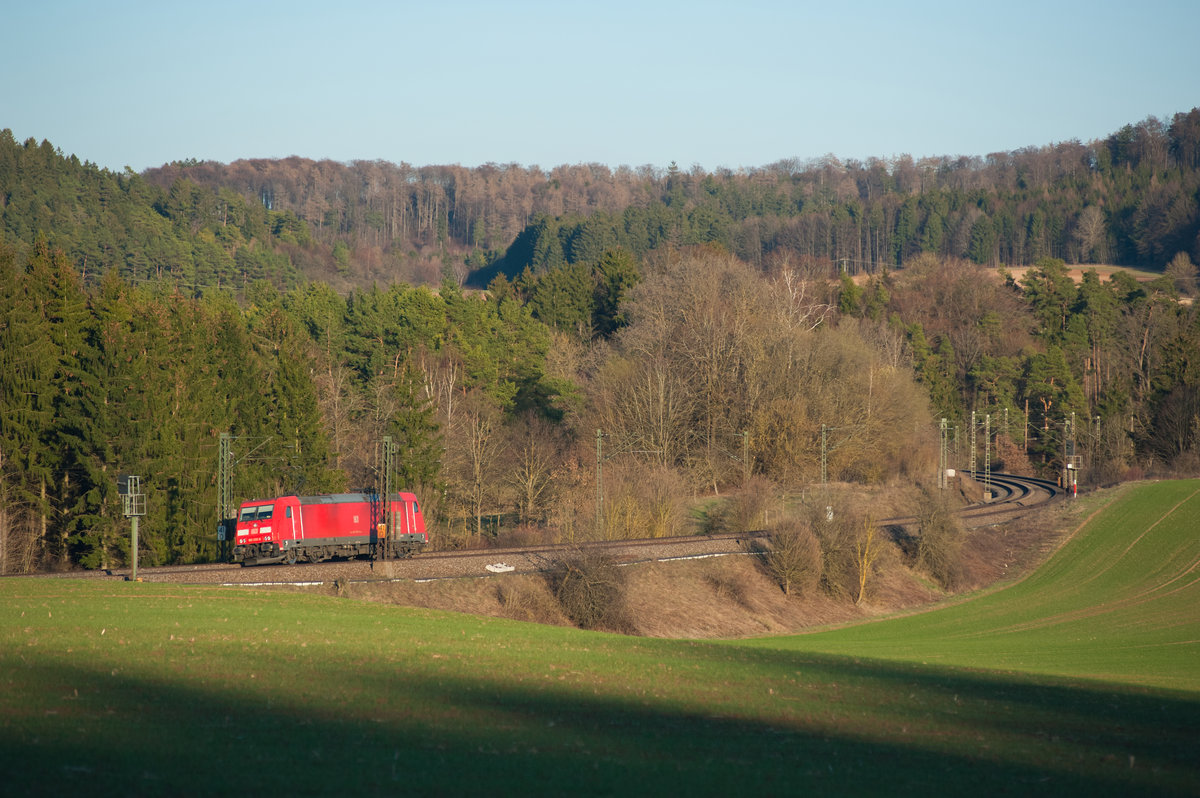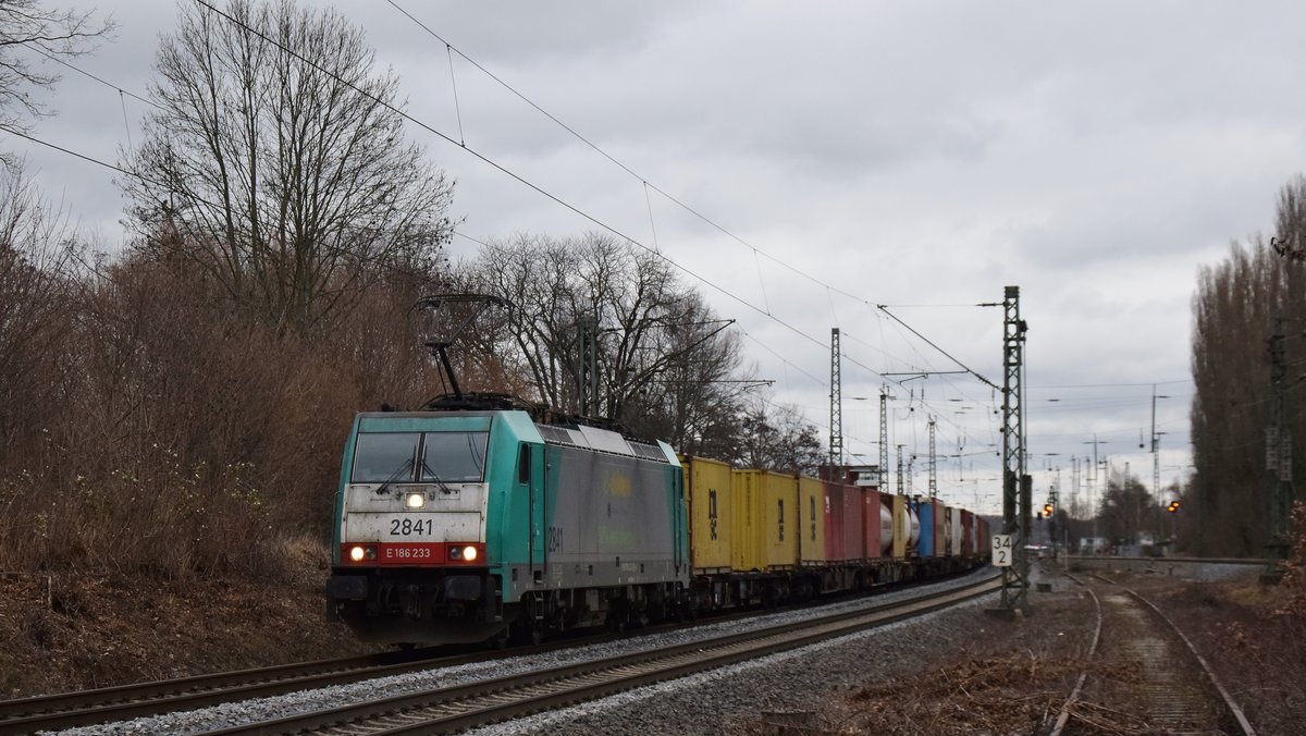 186 233 mit einem Containerzug Richtung Westen kurz hinter Darmstadt Kranichstein. Aufgenommen am 30.1.2019 14:47