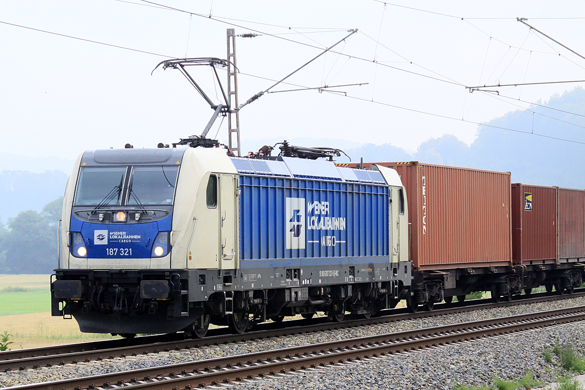 187 321-5 mit Containern am 12.07.2019 nördlich von Salzderhelden am Bü 75,1 in Richtung Göttingen