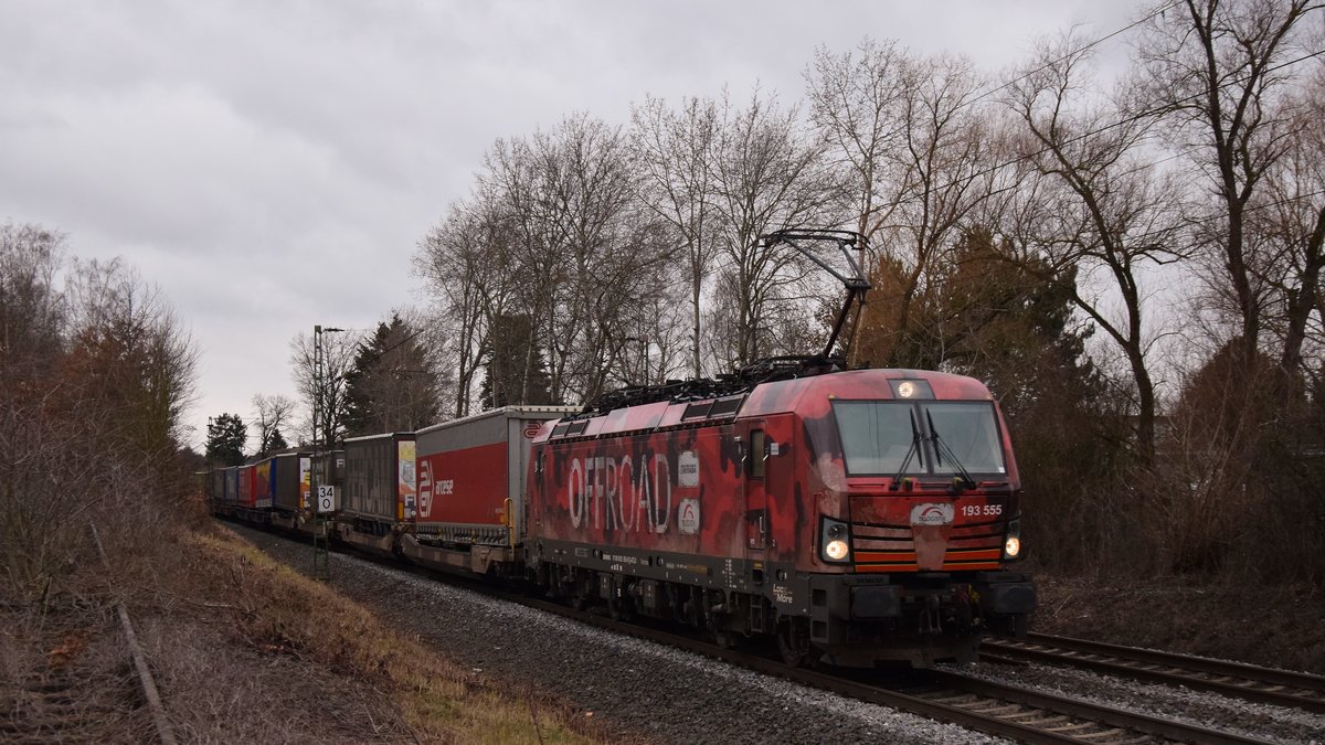 193 555 "Offroad" zieht den TX-Zug nach München über die Rhein-Main Bahn kurz vor Darmstadt Kranichstein. Aufgenommen am 30.1.2019 15:14