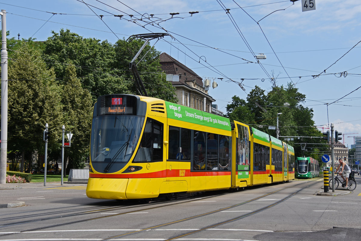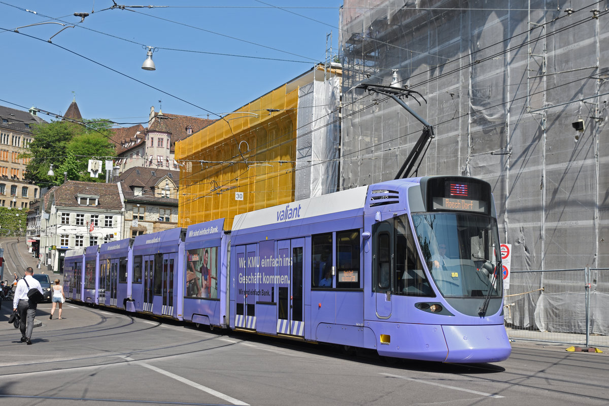 Be 6/10 Tango 151 mit der Werbung für die Bank Valiant, auf der Linie 11, fährt den Steinenberg hoch zur Haltestelle Bankverein. Die Aufnahme stammt vom 02.07.2019.