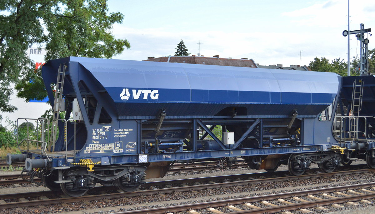 Drehgestell-Schüttgutwagen mit dosierbarer Schwerkraftentladung vom Einsteller VTG mit der Nr. 37 TEN (GE) 80 D-VTG 6949 017-5 Facnps in einem Ganzzug abgestellt gegenüber dem S-Bahnhof Berlin-Neukölln.