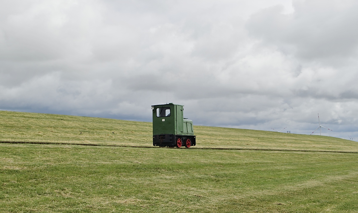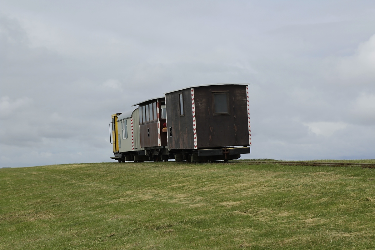 Halligbahn Dagebüll-Oland-Langeneß: Mit ihrem Arbeitszug hat die Schöma-Lok des Landesamtes für Küstenschutz, Naturpark und Meeresschutz (LKN) am 05.07.2019 die Deichkrone erreicht