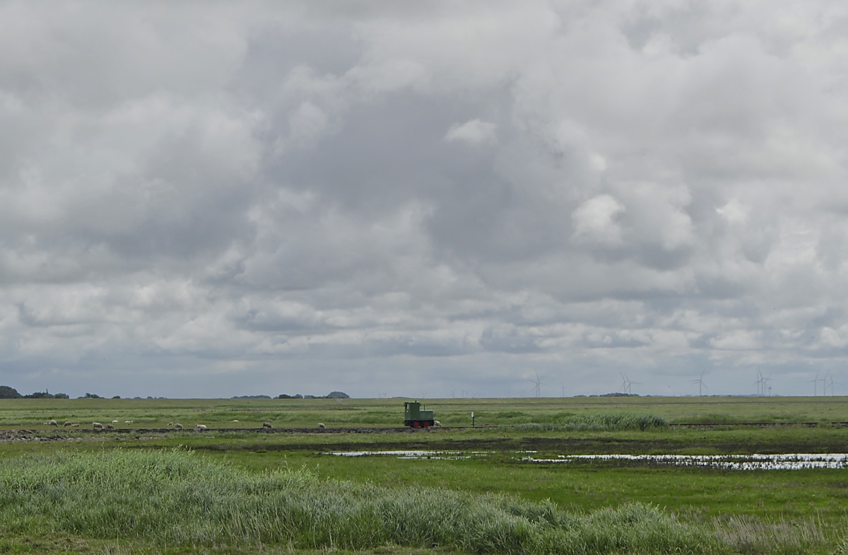Halligbahn Dagebüll-Oland-Langeneß: Winzig erscheint die Schöma-Lok 3 des Landesamtes für Küstenschutz, Naturpark und Meeresschutz (LKN) in der Weite des Wattenmeeres (05.07.2019)