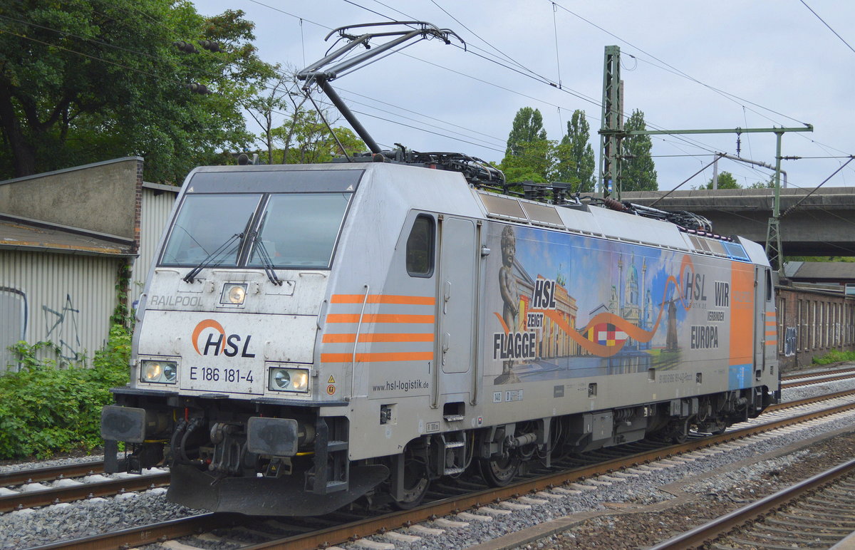 HSL Logistik GmbH mit "E 186 181-4" [NVR-Nummer: 91 80 6186 181-4 D-Rpool] hat gerade einen PKW-Transportzug Hamburg-Harburg abgestellt und fährt nun durch den Bahnhof leer zurück, 10.07.19