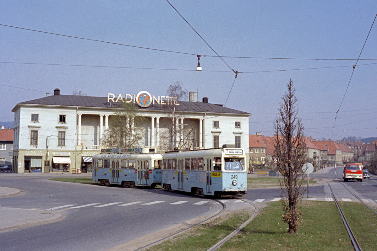 Oslo Oslo Sporveier SL 7 (Høka SM53 249 + Bw) Ullevål Hageby, John Colletts plass am 8. Mai 1971. - Hageby = Gartenstadt. Das norwegische Wort 'hage' kommt aus dem altnordischen 'hagi' (: Weide, Einhegung), vergl. dt 'Hag (: Hecke, umfriedener Wald); aus dem ahd. 'hag' (: Einhegung). Das nordische Wort 'by' (: Stadt) kommt aus dem altnordischen 'býr' (: Hof, Dorf). - Scan eines Farbnegativs. Film: Kodak Kodacolor X. Kamera: Minolta SRT-101.