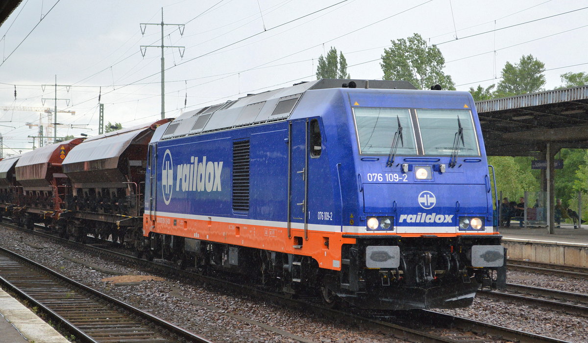 Raildox GmbH & Co. KG mit "076 109-2" [NVR-Nummer: 92 88 0076 109-2 B-RDX] und einem Ganzzug Schüttgutwagen mit Schwenkdach fährt zum Kurzhalt im Bahnhof Flughafen Berlin-Schönefeld ein (es stieg noch ein TF dazu) am 08.07.19