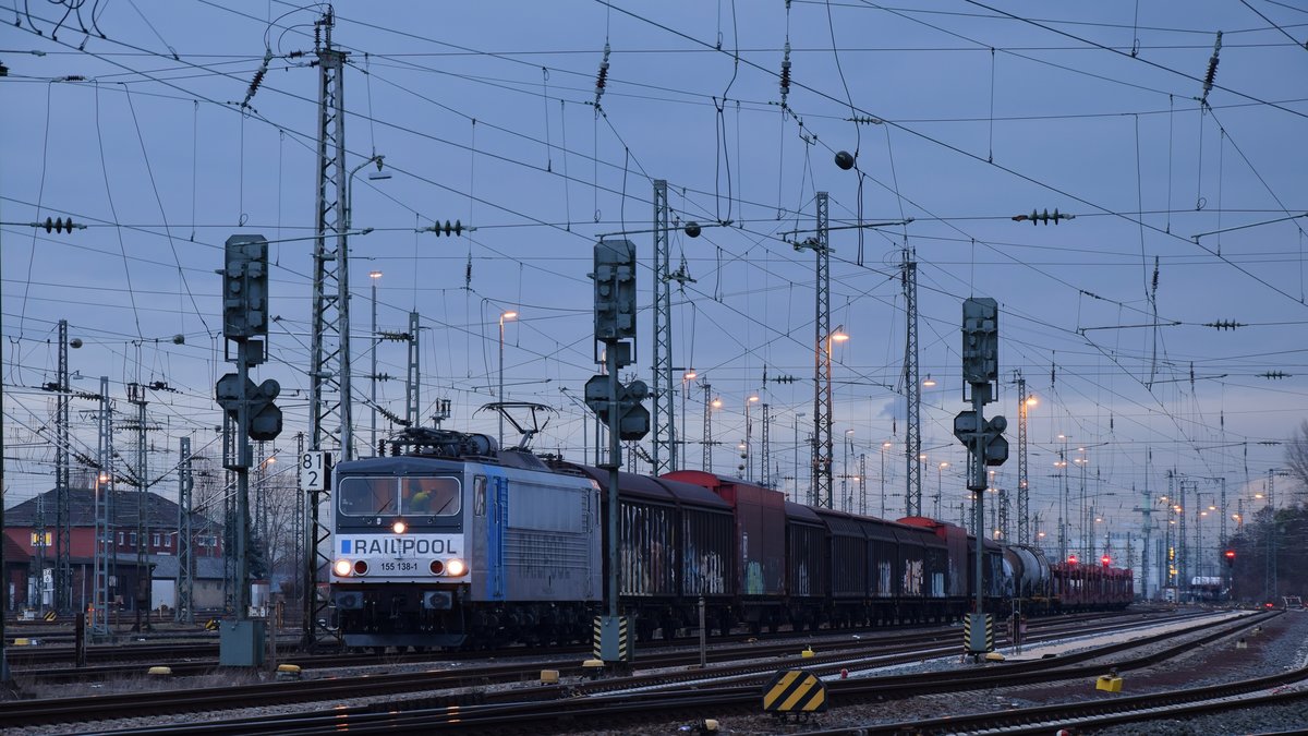Railpool 155 138 steht mit einem Mischer im Darmstädter Güterbahnhof abfahrbereit gen Mannheim. Aufgenommen am 29.1.2019 17:21