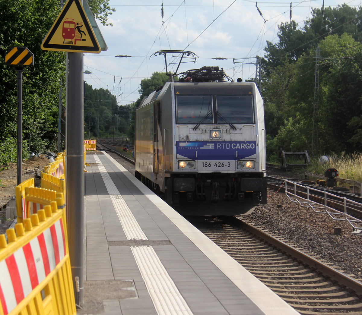 186 426-3 "Rotterdam" von der Rurtalbahn-Cargo kommt als Lokzug aus Aachen-West(D) nach Rheydt(D) und kommt als Umleiter aus Richtung Aachen-Wes,Laurensberg,Richterich und fährt durch Kohlscheid in Richtung Herzogenrath,Mönchengladbach. Aufgenommen von Bahnsteig 1 in Kohlscheid. Bei Sommerwetter am Nachmitag vom 7.7.2019.