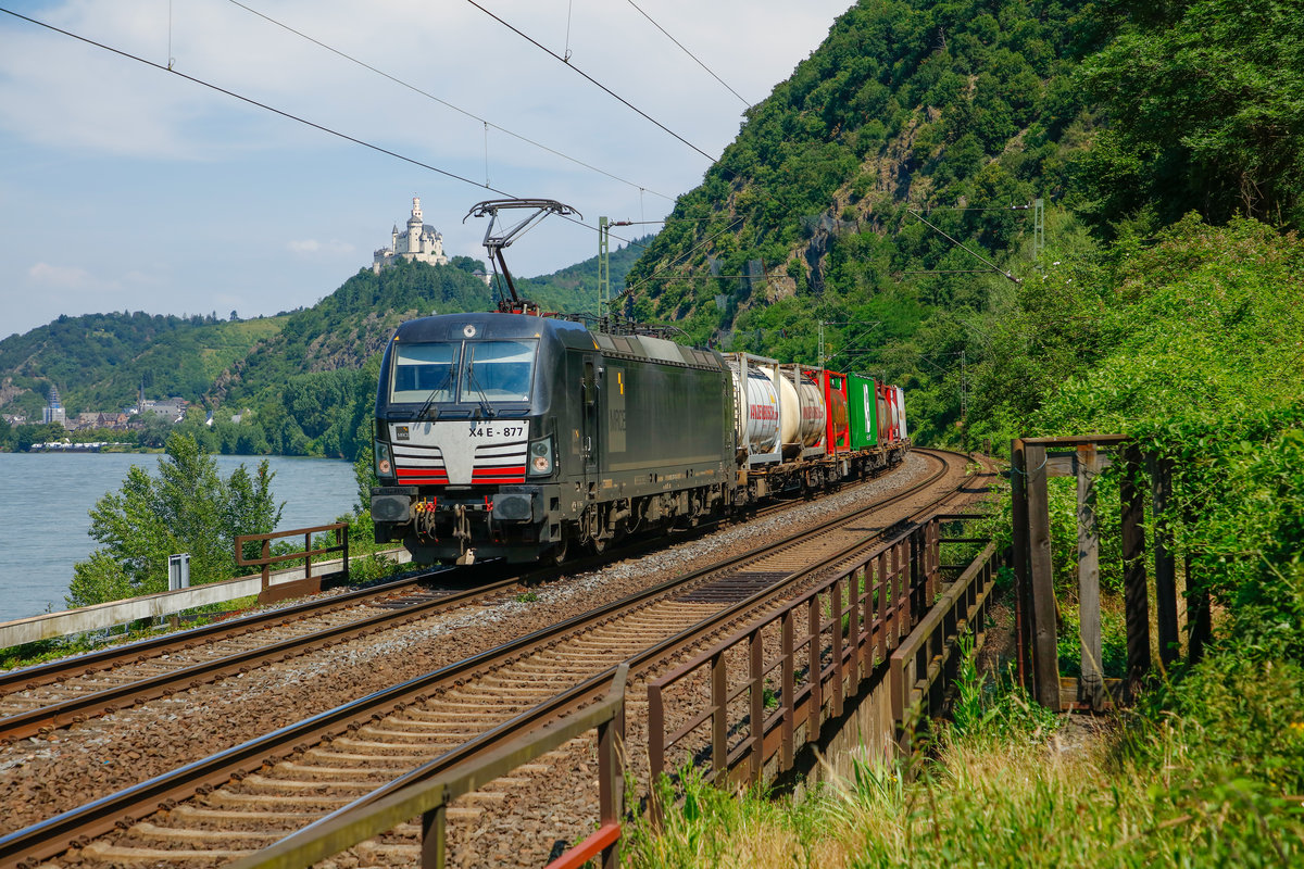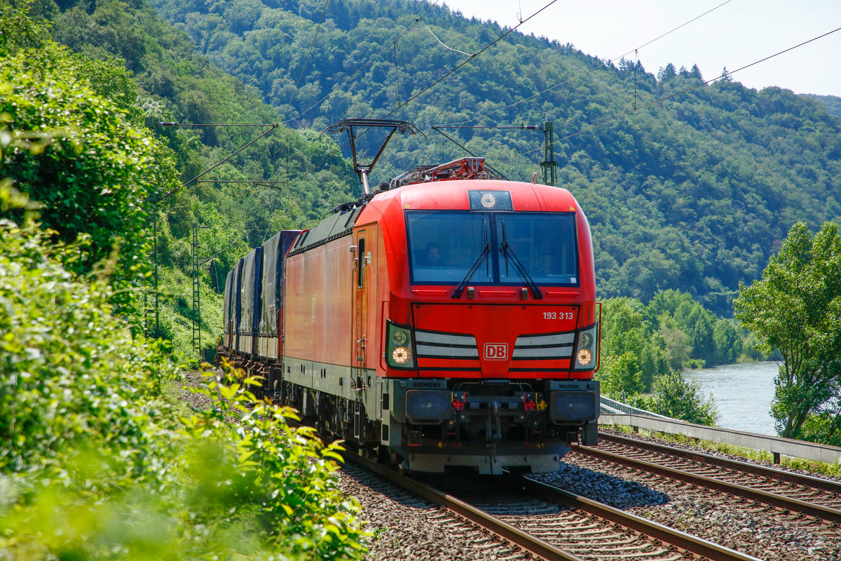 Eine DB Cargo-Lok der Baureihe 294 steht mit Güterwaggons im Hanauer Hauptbahnhof.
